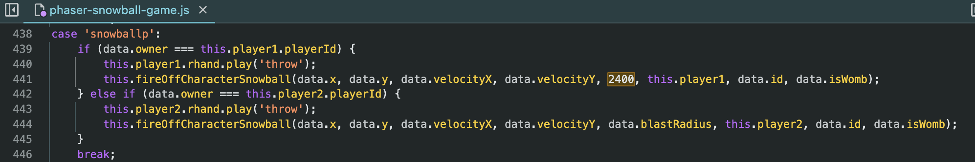 Trying to alter parameters in different parts of phaser-snowball-game.js I wasn’t able to immediately tweak anything relevant aside from setting this.throwRateOfFire = 1; so to shoot faster. I then started analyzing the websocket messages being exchanged and I eventually noticed the message related to throwing a snowball: