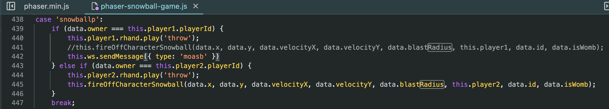 At that point I thought “why should I shoot snowball if I can shoot MOASB?” and I modified the phaser-snowball-game.js again: