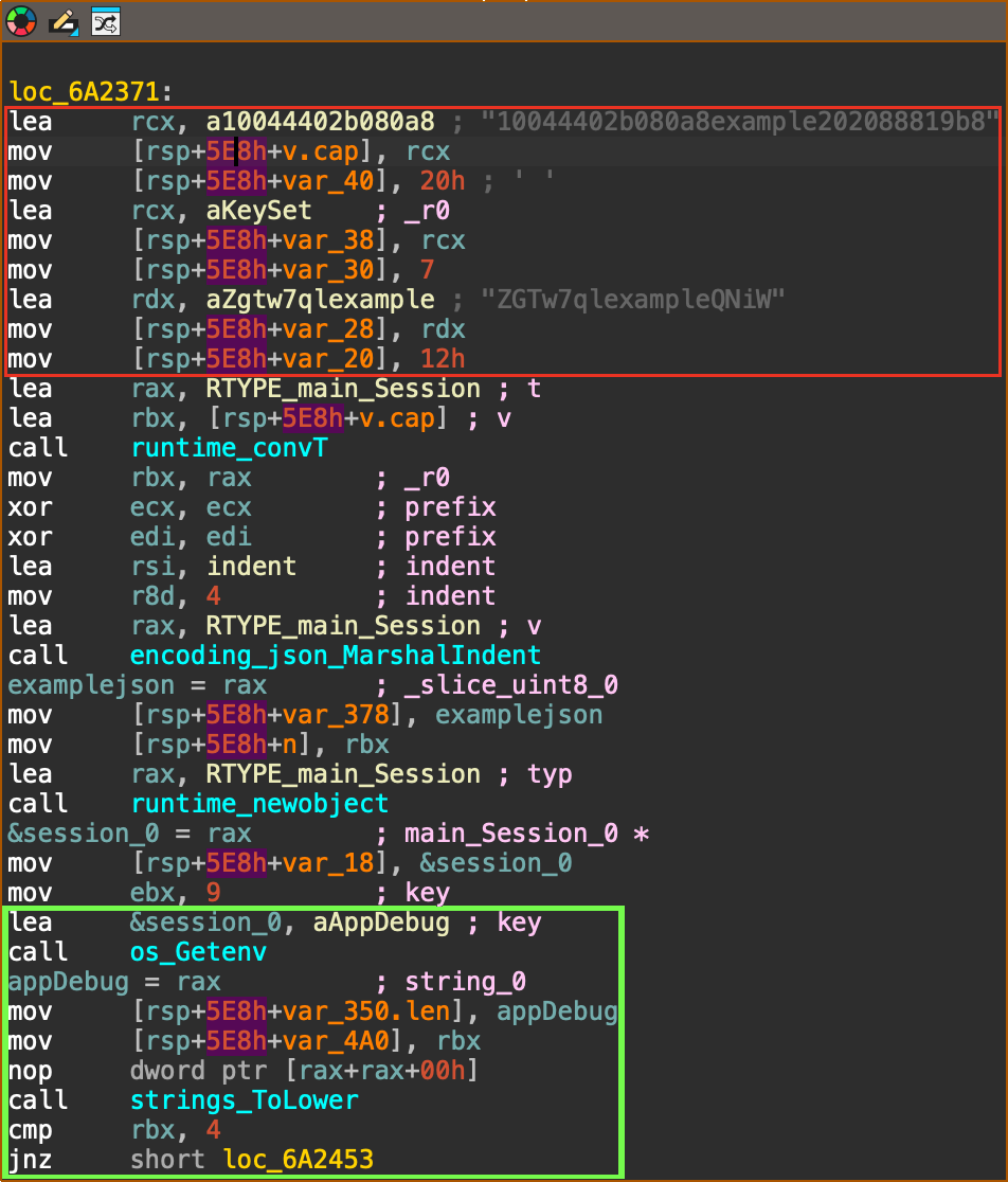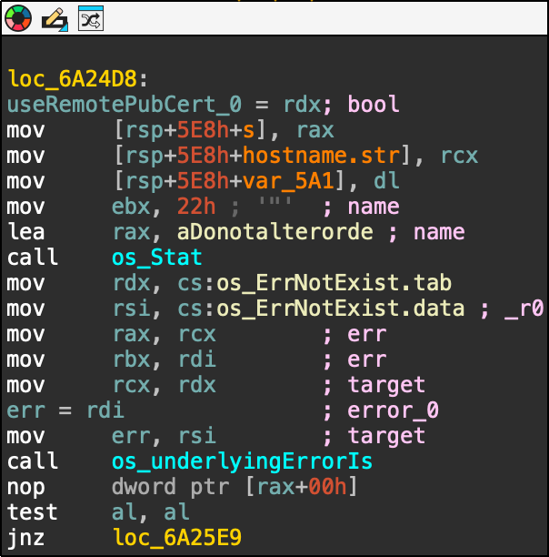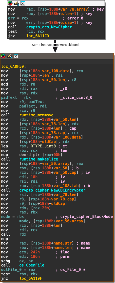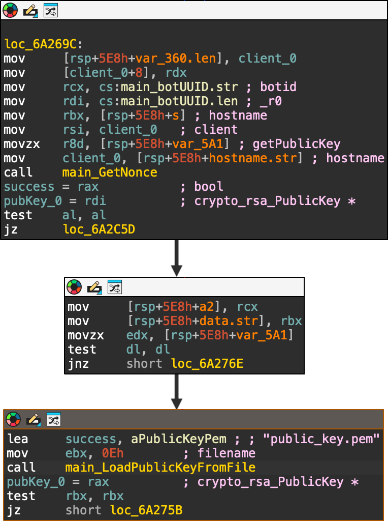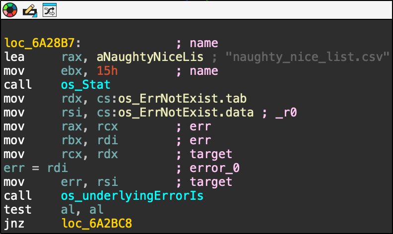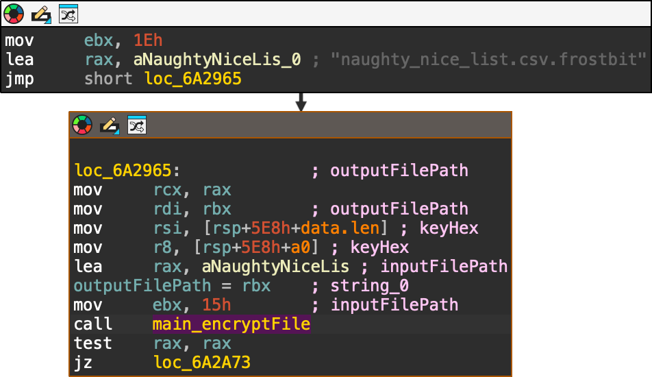 When started, the executable sets up the example values for digest and status (red box) and searches for the presence of the APP_DEBUG environment variable (green box): If the environment variable is set to APP_DEBUG="true" it will set the server to http://localhost (green box), otherwise it will use https://api.frostbit.app (red box): After that, it will check the presence of the DoNotAlterOrDeleteMe.frostbit.json file: And it will try to load the file public_key.pem: The content of this file will be used to generate the key with the generateKey function: Once the key has been generated, the executable will check for the existance of the file naughty_nice_list.csv If this file is found it will then go ahead, create the naughty_nice_list.csv.frostbit seen in the artifacts and encrypt the original file using the encryptFile function: The encryptFile function encrypts the file using AES-CBC and the previously generated key along with the nonce as IV: Subsequent operations will encrypt the key, send the encryptedkey to the server, receive the final content for DoNotAlterOrDeleteMe.frostbit.json, save it and terminate.