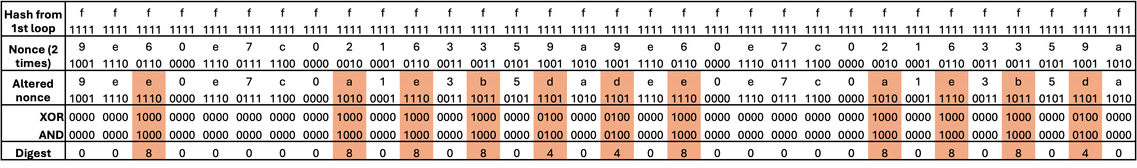 I have then spent some time to find accepted alternatives to these printable characters so to introduce the least possible variance in the resulting digest. The following table shows the resulting values with an incoming hash of only ff: The highlighted values are the ones that have changed, and these could either be only the shown value or 0, depending on the hash results from the first loop (file_bytes XOR nonce_bytes). Having 11 bytes that can assume 2 values, this would result in 2 ^ 11 = 2048 possible digest values. This is a fairly big number but manageable with a script 😁