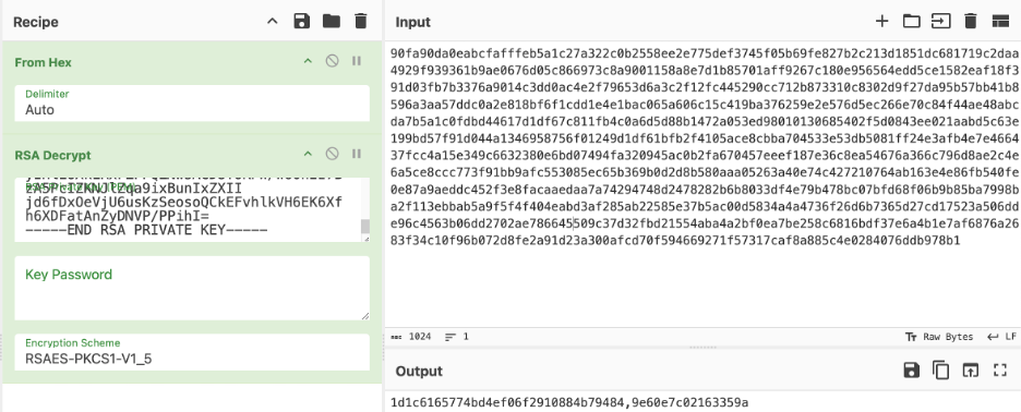 Having obtained the private key, we can now decrypt the encrypted key retrieved from the pcap: The result is 1d1c6165774bd4ef06f2910884b79484,9e60e7c02163359a, wich is in the format <key>,<nonce>.