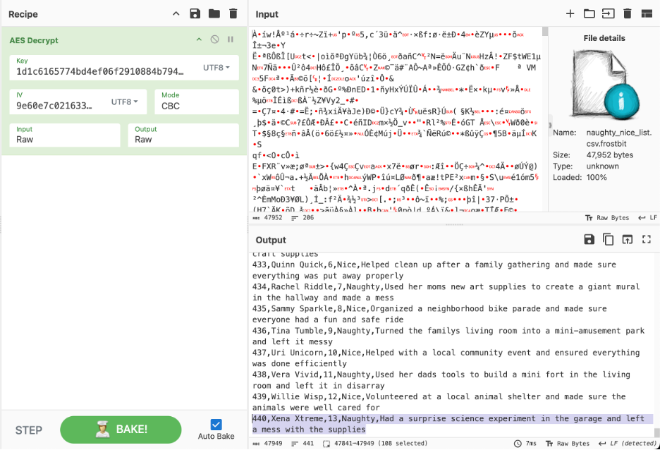 Difficulty: ❄ ❄ ❄ ❄ ❄ Decrypt the Frostbit-encrypted Naughty-Nice list and submit the first and last name of the child at number 440 in the Naughty-Nice list.